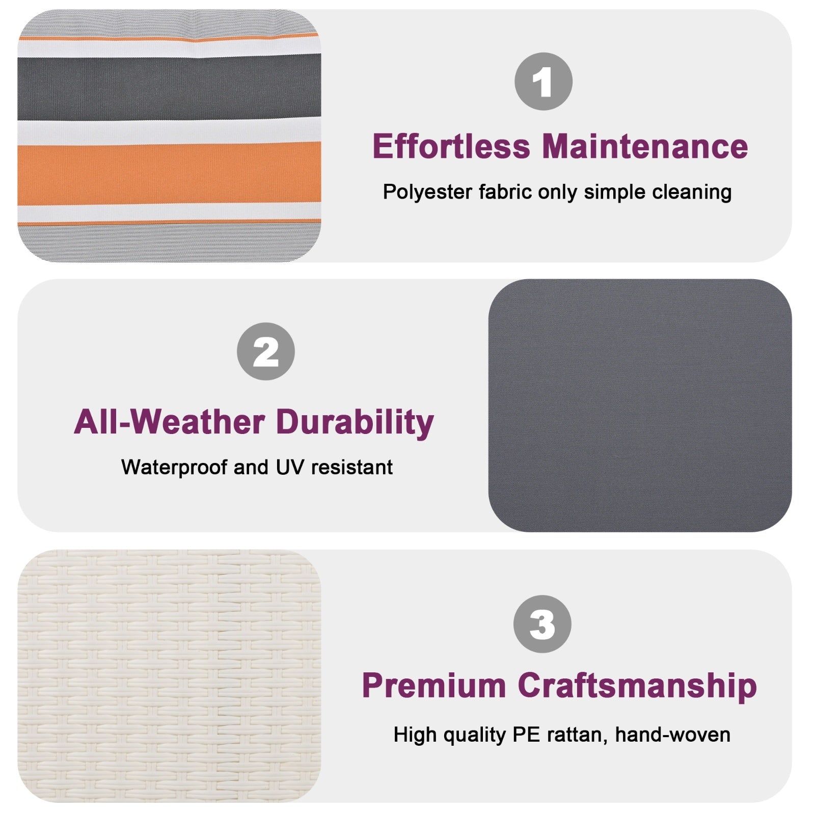 Vibrant Pillows: Accompanied by a generously sized seat cushion and back cushion, this ensemble is further enhanced by the addition of two vibrant pillows. These colorful accents not only offer an extra layer of comfort but also allow for personalized placement – whether nestled at your side or gently propped behind – ensuring a truly indulgent relaxation experience.